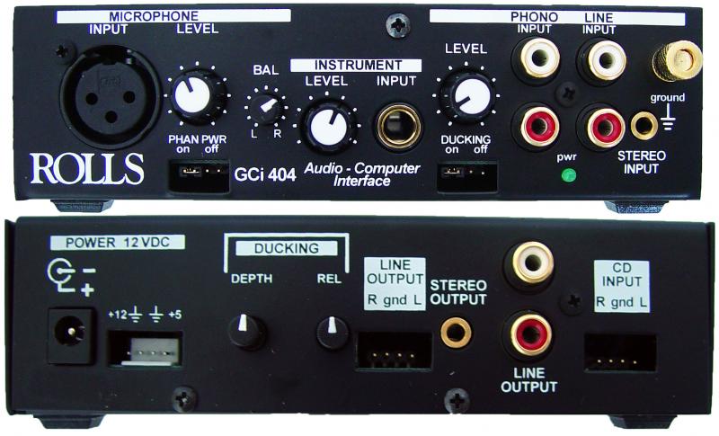 The GCi404 mixes a balanced XLR Microphone signal with a 1/4" Instrument signal and a group of stereo Line Input signals. The Microphone input has +12 volt phantom power, a variable Level control from no signal to +55 dB of gain, and a Balance control.