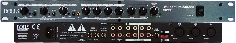 The RM67 is a single rack space mixer designed for the install/contractor market. The unit mixes three balanced microphones with four stereo sources to mono or stereo balanced outputs. The XLR Microphone Inputs have Mic/Line level switches, a send/return Insert jack, and individually switchable +12 VDC phantom power.