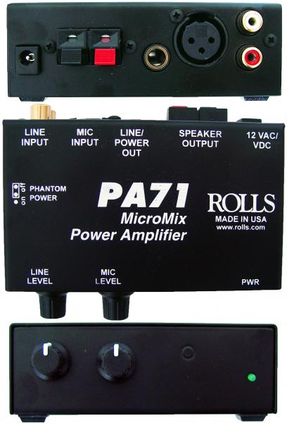 The PA71 mixes an XLR microphone signal with stereo (mixed to mono) RCA signals. The combined signal is sent to spring loaded output terminals via a seven watt power amplifier.