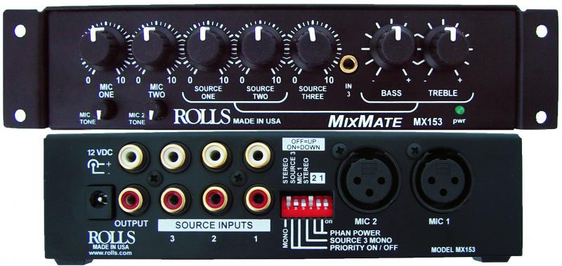 Source Three has a Level adjustment only. The Microphone inputs are balanced XLR jacks, all Source inputs are stereo RCA except for the front 1/8 jack on CH3 for an MP3 player, etc. The main output is stereo RCA. An included 12VDC adapter (Rolls PS27) provides power to the unit.