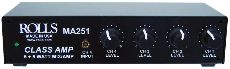 The new MA251 is a compact class D stereo amplifier with a 4 CH. stereo mixer built in. It has 5 watts per channel @ 4 Ohms. The class D low heat design gives the MA251 the ability to be mounted in very tight applications.