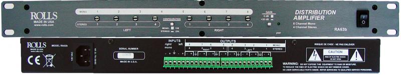The RA63b is an eight channel mono, or four channel stereo distribution amplifier designed for the contractor / install market. The outputs are designed to drive high-level balanced lines in a sound distribution system.