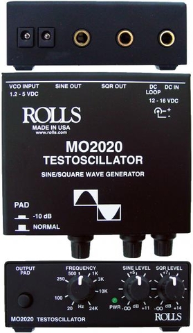 The MO2020 provides a sine and square wave output on two 1/4" jacks. The frequency range is variable from 20Hz to 24kHz, it accepts a 1.2 to 5 volt dc input on a 1/4" jack for external frequency control, and a 10 dB Output Pad is included to provide a -10 dB reference signal.